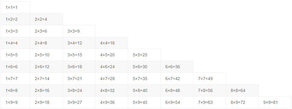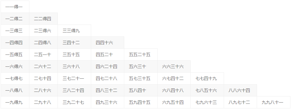 一九得九 | 二九十八 | 三九二十七 | 四九三十六 | 五九四十五 | 六九五十四 | 七九六十三 | 八九七十二 | 九九八十一 |
